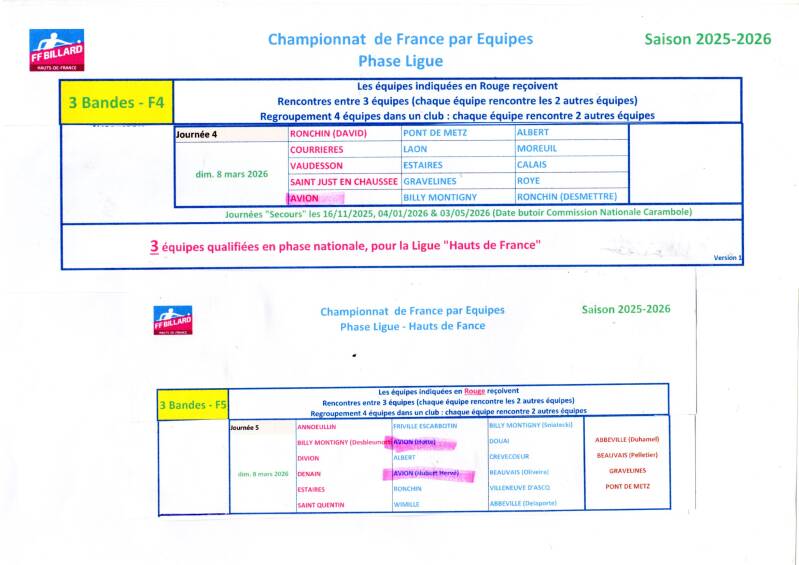 En fédérale 5 Le 8 mars 2026 l'équipe composée de J.L HOTTE, F.HUBERT, et T.HUBERT se déplace à Billy-Montigny avec l'équipe de Douai. L'équipe composée de H.HUBERT, P.CARLI et F.EVRARD se déplace à Denain avec l'équipe de Beauvais.